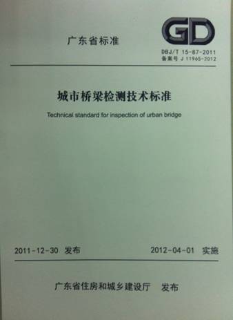 省建科院牵头主编的广东省标准《城市桥梁检测技术标准》(DBJ/T 15-87-2011)于2011年底编制完成并顺利通过了以周福霖院士为评审组长的专家组审查,近期获得住建厅批准颁布,2012年4月1日起正式实施。