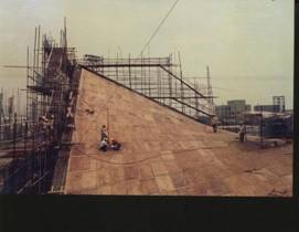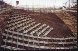 现代建筑物的设计千变万化,一些具有特殊功能的建筑物,其外形更与众不同,使城市建筑多姿多彩,达到美的效果。有些建筑物,将壳面做成斜面甚至双曲面的形状,当坡度大于27°的倾斜壳面时不能采用常规的混凝土楼面的施工方法,因为在混凝土浇筑振实时混凝土会向下流淌。因此,要采取适当的措施来阻止混凝土浇筑振实时向下流淌,以保证壳面混凝土的施工质量。