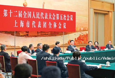 (3月5日,习近平参加十二届全国人大一次会议上海代表团的审议。)